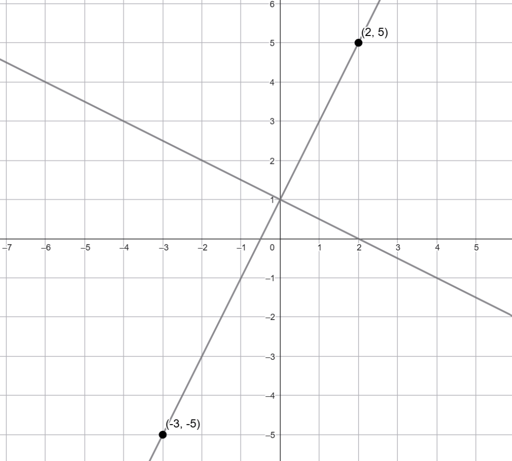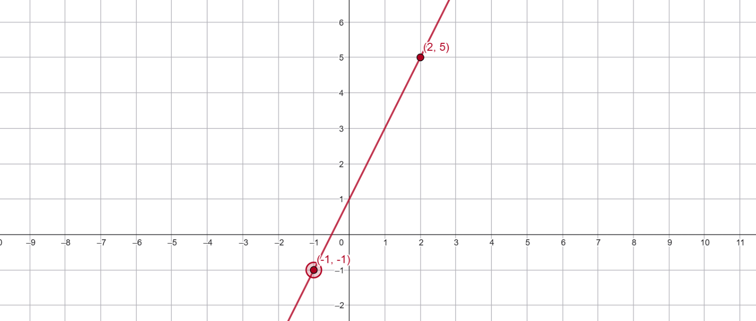 Find the equation for a line perpendicular to this line that goes through the points (-1,-1), (2,5)