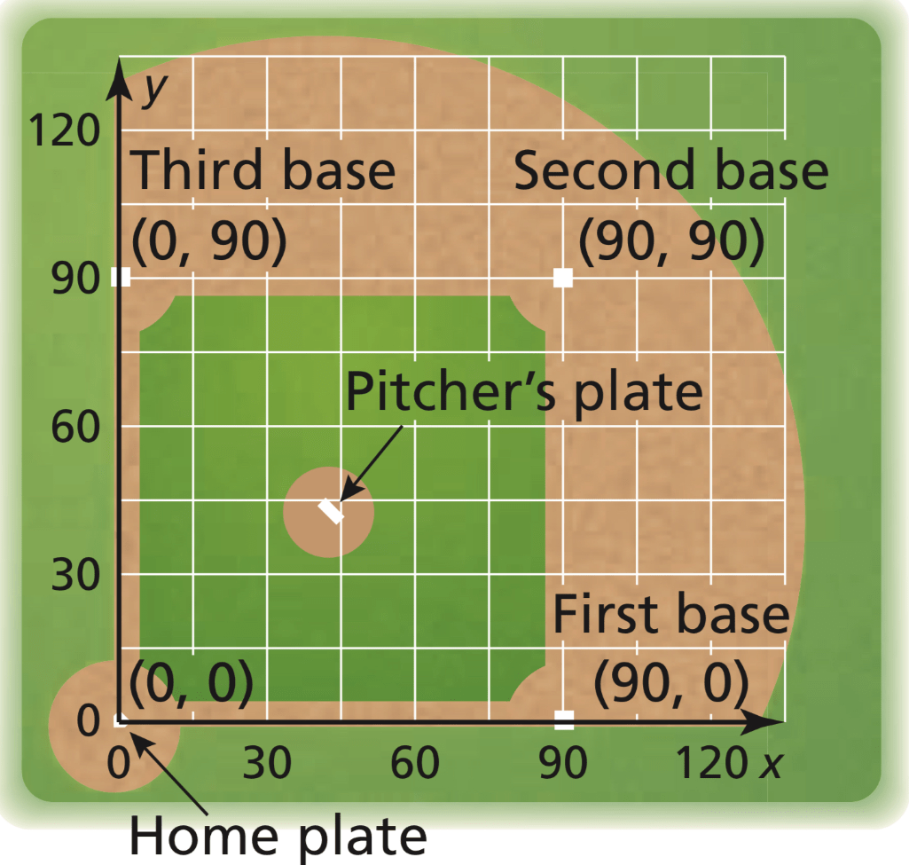 The coordinate plane shows distances (in feet) on a baseball infield. The pitcher’s plate is about 3 feet closer to home plate than the midpoint between home plate and second base is to home plate. Estimate the distance between home plate and the pitcher’s plate.