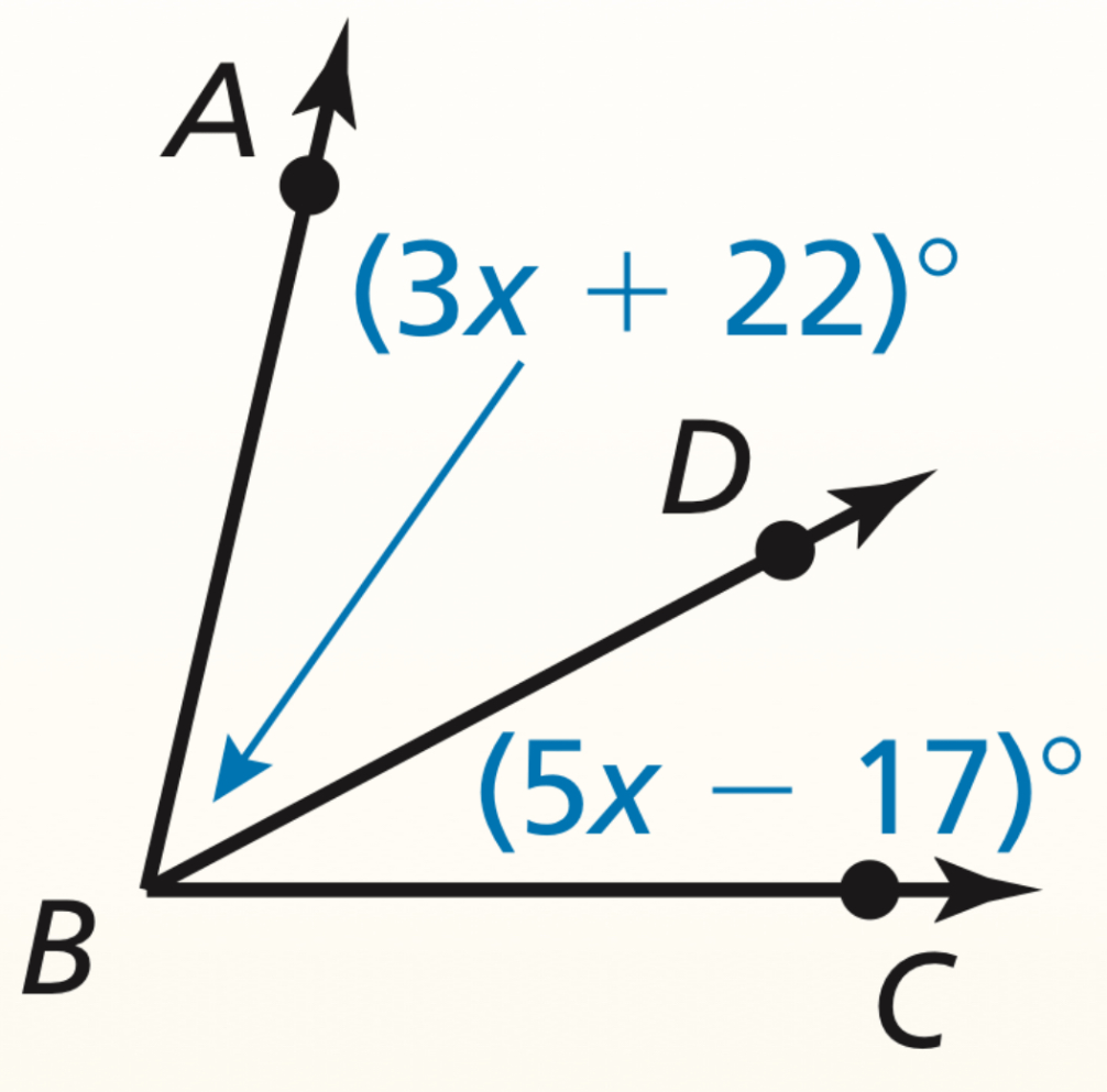 BD bisects ∠ABC. Find m∠ABD, m∠CBD, and m∠ABC.