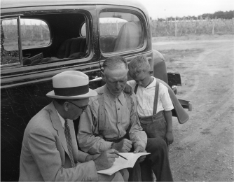 Use the 1934 photograph of a farmer signing up for the farm program established under the Agricultural Adjustment Act to answer the question.