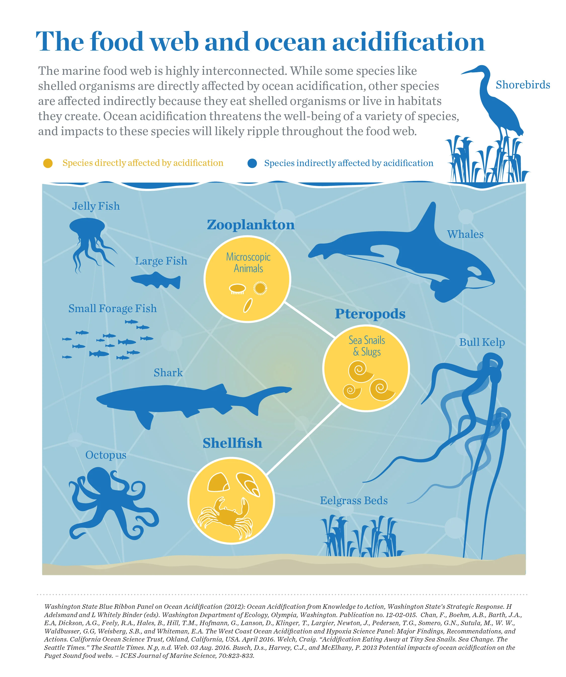 Explain how marine food webs are affected by ocean acidification and global warming.