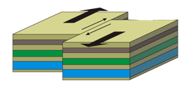 Shear forces cause rock on either side of the strike-slip fault to move past one another in opposite directions along Earth's surface.