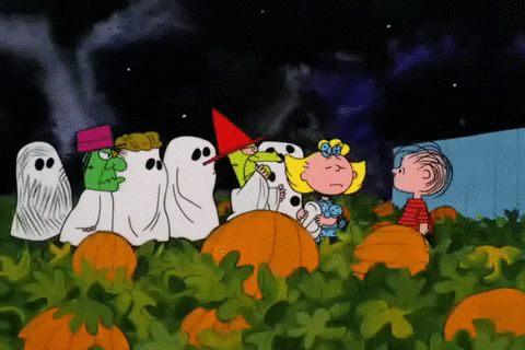 A ragtag group of friends gang celebrates Halloween while one of them waits for a large anthropomorphic gourd