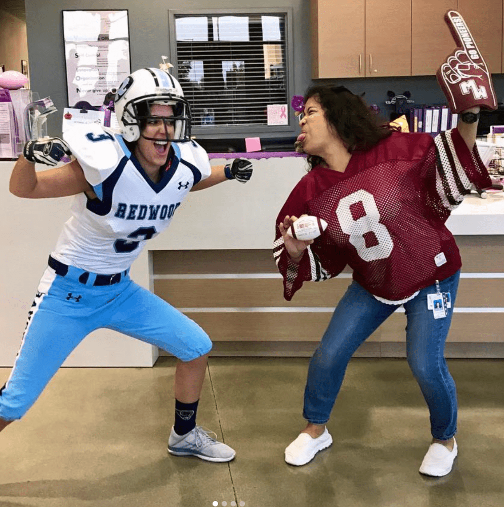 In 2018, Ainley dressed up as a Visalia high school football player to work. Which high school did she represent?
