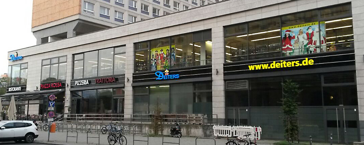 What Halloween store in Alexanderplatz is famous for their crazy long lines, and impressive selection of goods for costumes, makeup , and accessories?