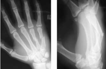 Displaced, dorsally angulated transverse fractures of the metacarpal shafts of the ring and small fingers.