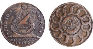 The coin that said "Mind Your Business" is the Fugio Cent, America's first official copper coin, minted in 1787 and designed with input from Benjamin Franklin, serving as a reminder for diligence and hard work, especially important for the new nation's unity.