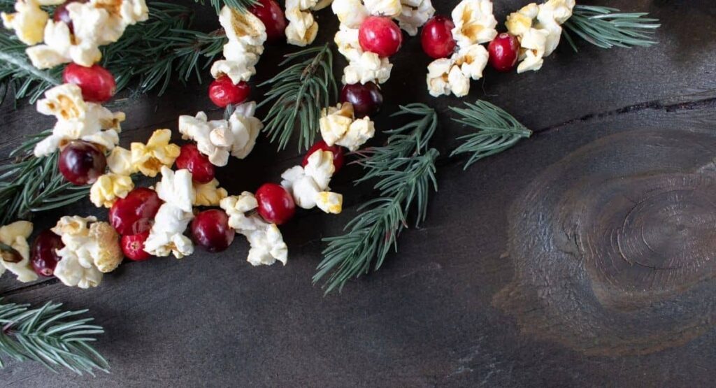 This tradition is rooted in 19th-century German-American history was a practical, affordable, and deeply symbolic way for families to make tree garlands using natural, readily available materials long before mass-produced ornaments and electric lights became the norm. Name the two materials strung.