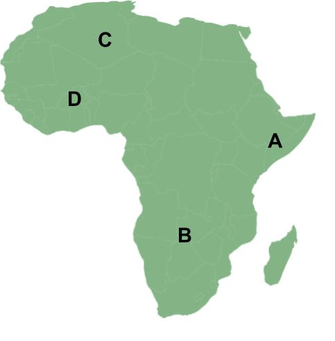 Which letter shows the approximate location of the three great Kingdoms that arose in West Africa during the Middle Ages?