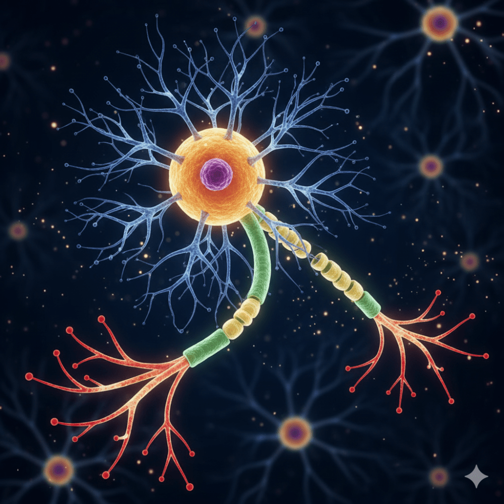 List at least 5 parts of the neuron, including the signals that are passed between neurons.