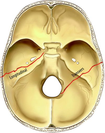Longitudinal ➜ conductive (along the petrous portion's mountain range)