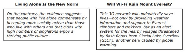 Although solitude is mentioned in both articles, the author of “Living Alone Is the New Norm” uses research to explain his ideas, while the author of “Will Wi-Fi Ruin Mount Everest?” describes his personal experiences and provides anecdotes to support his ideas