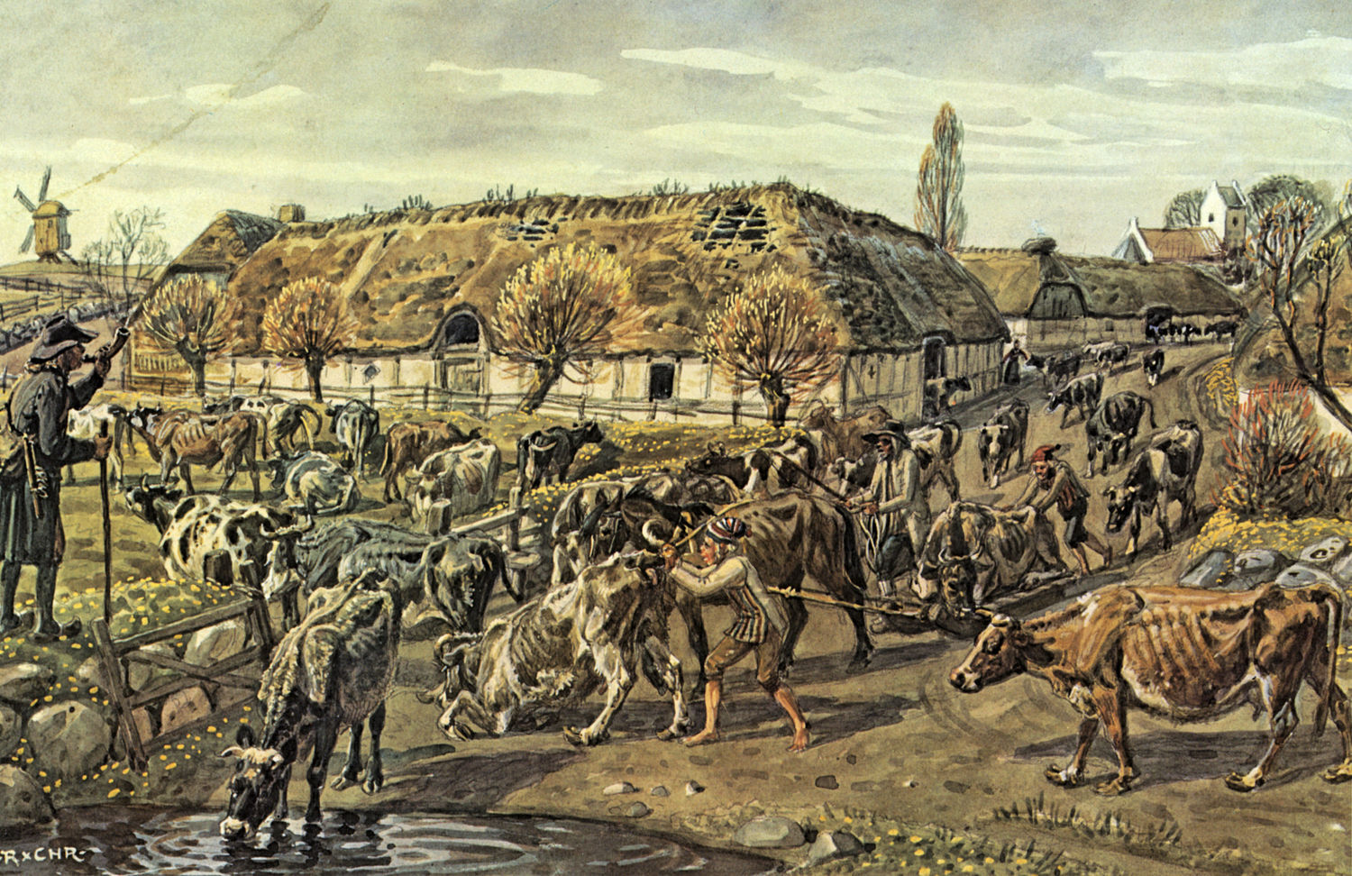 Køer lukkes på græs, Billedet er malet omkring år 1900. Det viser en situation i 1700-talllet, hvor køerne efter en lang vinter skal på græs om foråret, © Landbohistoriske billeder/Tune Landboskole