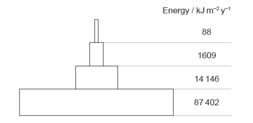 Two factors that lead to the loss of energy between trophic level in a food chain as shown in this pyramid of energy.