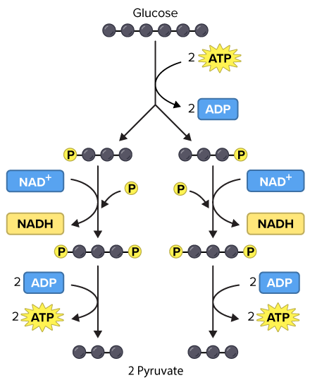 In glycolysis, glucose is ________ into pyruvate while NAD+ is ________ into NADH