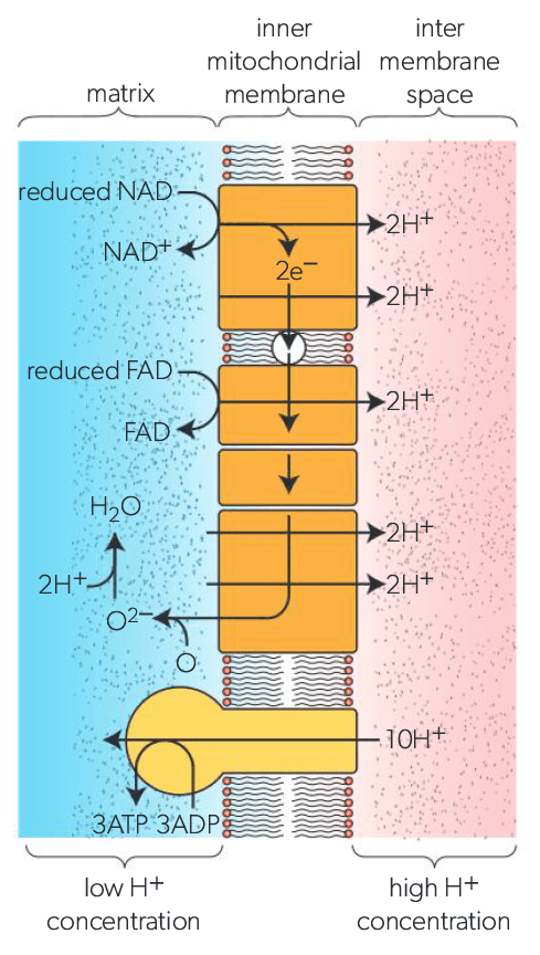 Number of protons pumps across the inner mitochondrial membrane per NADH and FADH2, respectively.