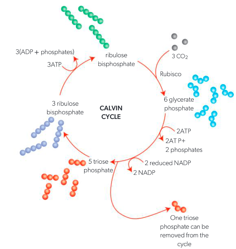 The Calvin cycle continues throughout the life of a plant. In this cycle, triose phosphate is produced, which is used to form glucose.