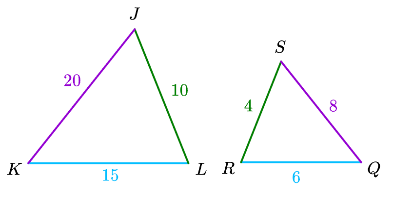 B) triangle JKL is similar to triangle SRQ through a dilation.