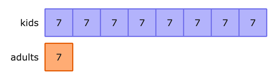 The Culver City Carnival had a face-painting booth. The ratio of kids to adults is 8:1. If 56 kids had their faces painted, how many people had their faces painted altogether? Draw a tape diagram to show your reasoning.