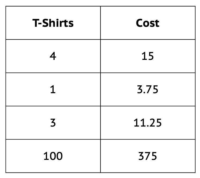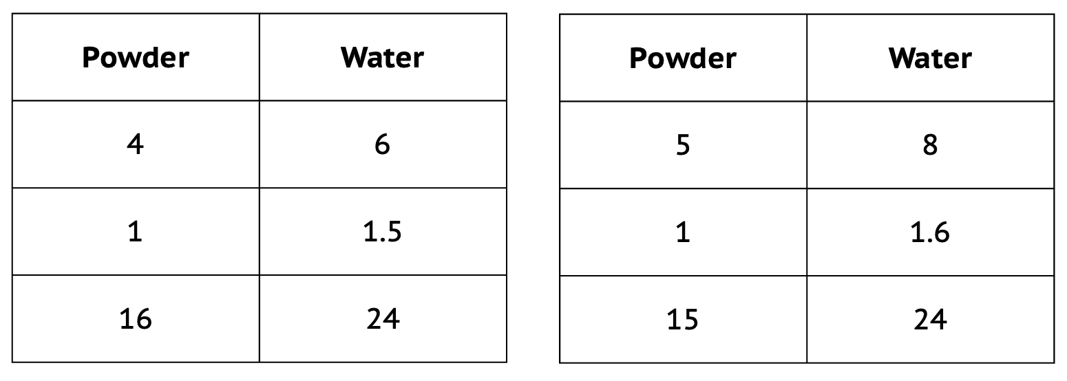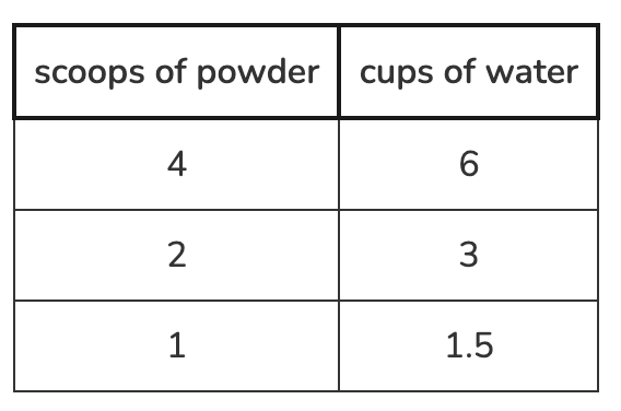 Noah mixes 4 scoops of powder with 6 cups of water. Make a table that shows how much water is needed for 2 scoops of powder and for one scoop of powder.
