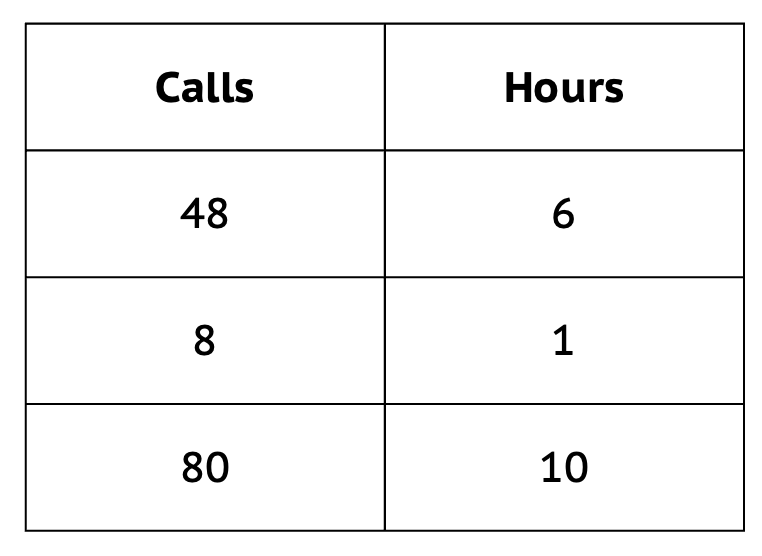 A telemarketer made 48 calls in a 6-hour time frame. If they continue placing calls at this rate, how many calls can they make in 10 hours? Use a table to show your reasoning.