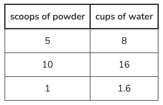 Andre mixes 5 scoops of powder with 8 cups of water. Make a table that shows how much water is needed for 10 scoops of powder and for one scoop of powder.