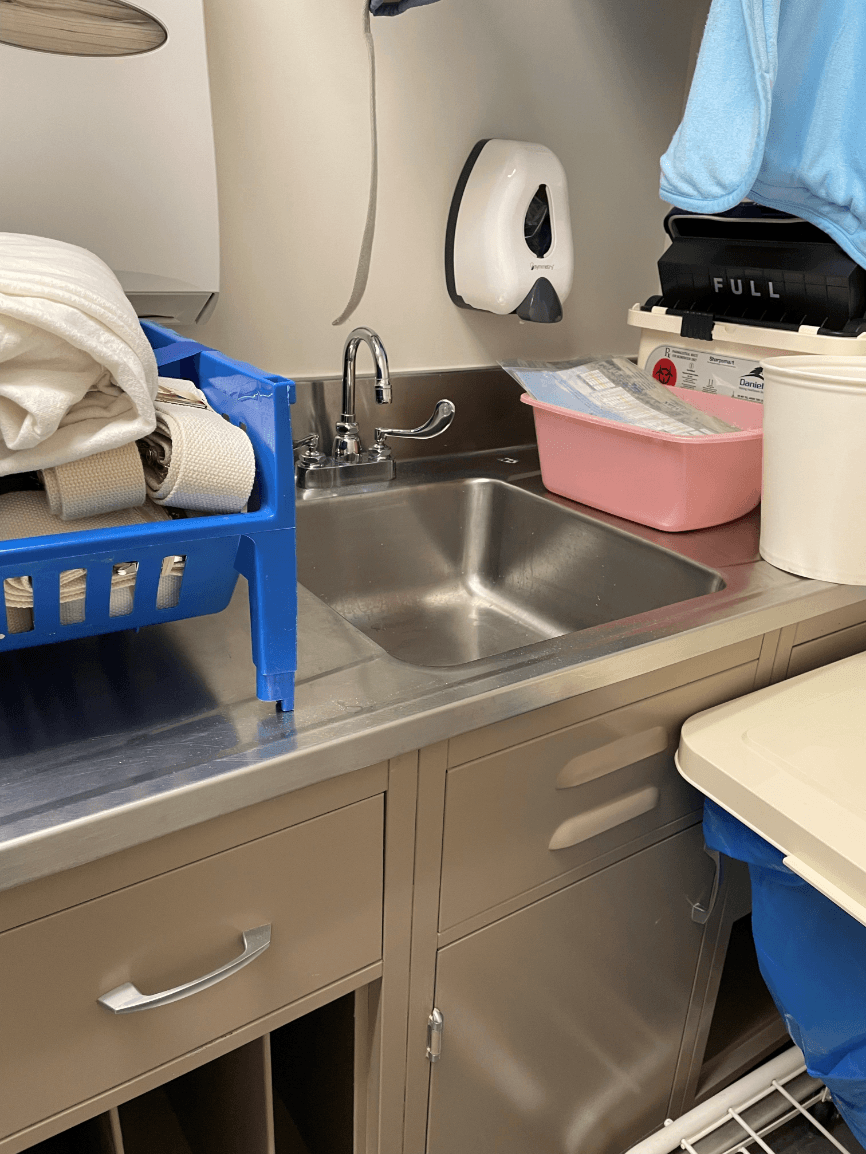 A physical therapist is cleaning the equipment room walkers. They stack the dirty walkers on one side of the room and stack clean on a different side of the room, always cleaning the dirty first and moving to clean.