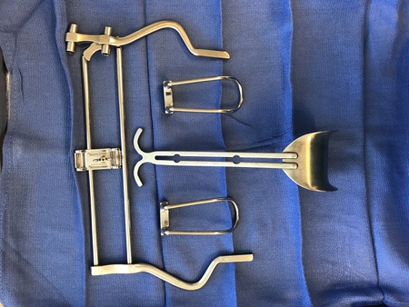 Abdominal procedures - A Balfour retractor is used for deep abdominal retraction. Small (baby) and adult (larger) versions are available. Moistened lap pads are placed between the retractor and the patient's tissue.