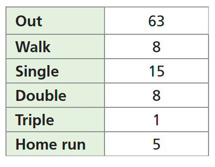 Shane plays baseball. The chart shows the results of his first 100 times at bat. Write a proportion and solve it to predict the number of home runs Shane will hit in his next 460 times at bat.