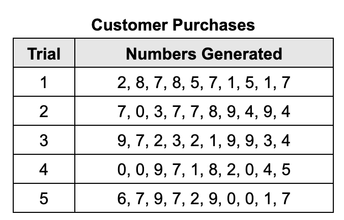 There is a 20% chance that a customer walking into a store will make a purchase. A computer was used to generate 5 sets of random numbers from 0 to 9, where the numbers 0 and 1 represent a customer who walks in and makes a purchase.What is the experimental probability that at least one of the first three customers that walks into the store will make a purchase?