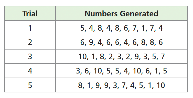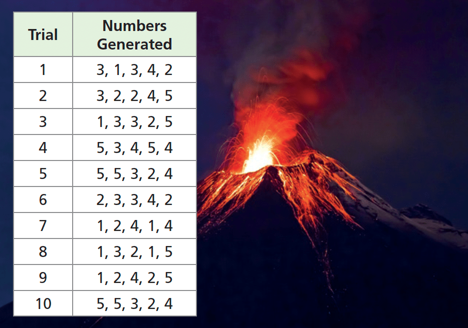 There is a 20% chance that a particular volcano will erupt during any given decade. A random number generator generated 10 sets of random numbers from 1 to 5 as shown. The number 1 represents the volcano erupting. Find the experimental probability that the volcano will erupt in 1 or 2 of the next 5 decades.