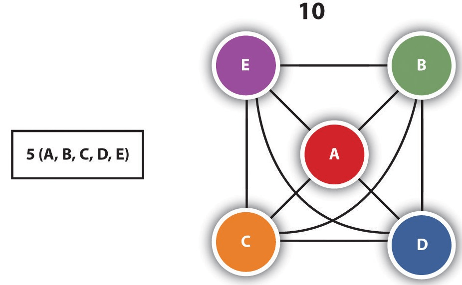 Jane and Ash have decided to join a club of video game fans on campus. The original group had three people, meaning there were 3 social connections. Once Jane and Ash joined, the group expanded to five people, creating _____ possible social connections. This illustrates that as groups increase in size, the number of social connections increases as well.