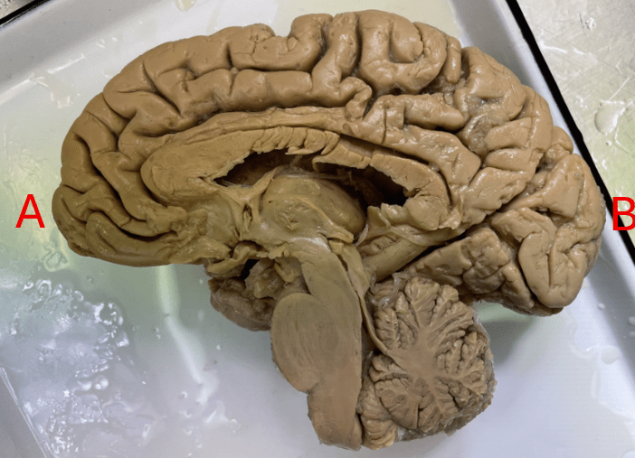 This is a mid-sagittal view of the brain. Identify which letters are anterior vs. posterior.