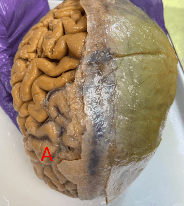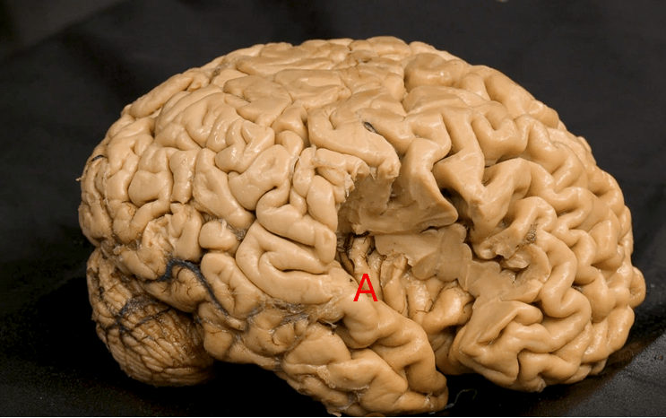 A portion of the parietal and frontal lobes is resected. Identify the structure that lies on the superior surface of the lateral fissure, marked "A".