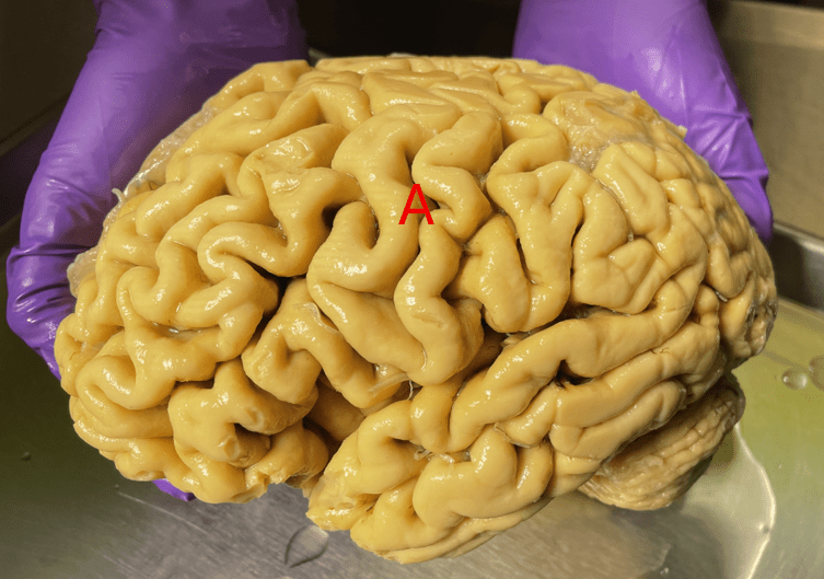 Name the sulcus labeled "A" and the two lobes it separates.