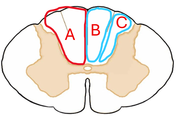 In the spinal cord cross section below, identify structures A, B, and C