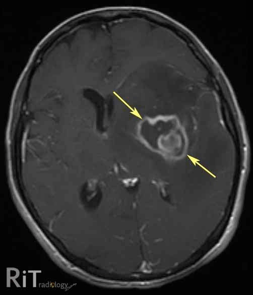2) CNS lymphoma (hyperdense, round enhancing lesions)
