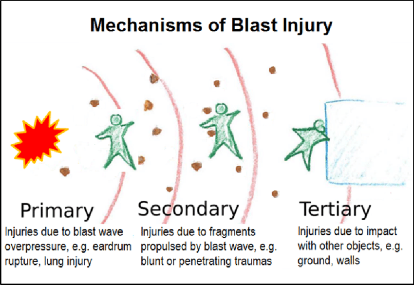 Injury due to projectiles from explosion (penetrating trauma, amputations, lacs)