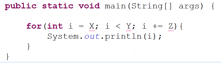 If we want to count from 10 to 20 by 2s what are X, Y, and Z in the code below: