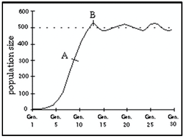 A- The population is growing exponentially. B- the population has reached its carrying capacity because limiting factors have slowed the growth.