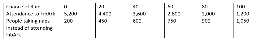 How many people would be predicted to be at FibArk when there is a 50% chance of rain? How many people would be taking naps at a 50% chance of rain?