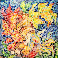Una imagen o patrón intrincado producido por la organización de pequeños trozos de baldosa, piedra o vidrio: