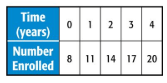 The table below shows the number of kids in a karate class as a function of time (in years). Explain what the coordinate (2,14) is communicating.