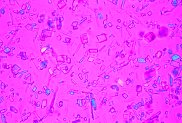 Cystine crystals - hexagonal shaped crystals