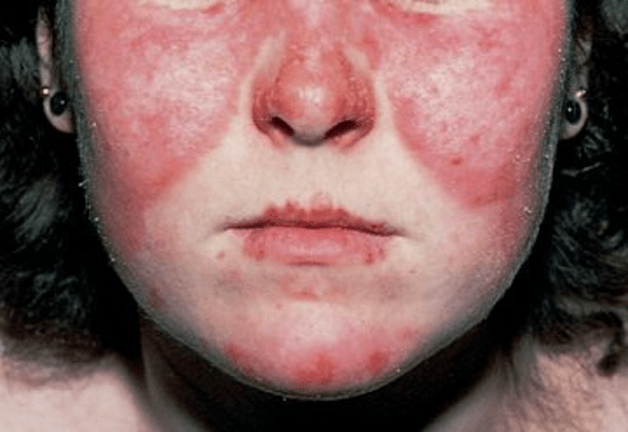 •Acute cutaneous lupus erythematosus (ACLE) is characterized by erythema/edema over the cheeks and bridge of the nose, sparing the nasolabial folds.