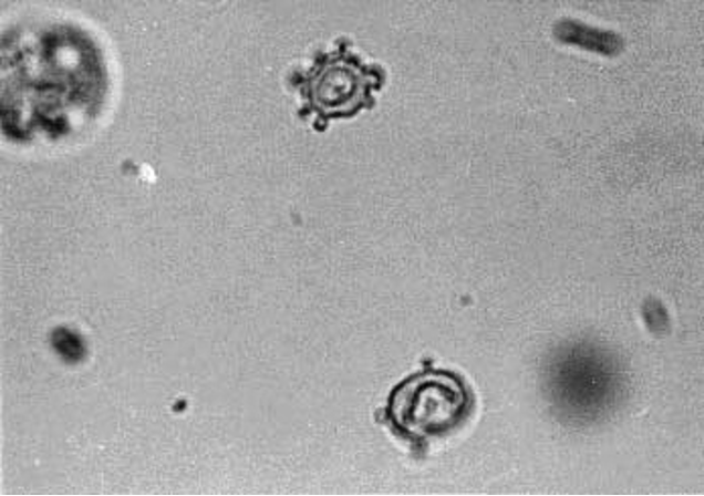 Findings show dysmorphic red blood cells ("micky mouse" RBC with out-pouching of the membrane) often seen in glomerulonephritis
