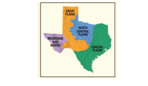 Draw me Texas and label the 4 regions of Texas on it as close as possible