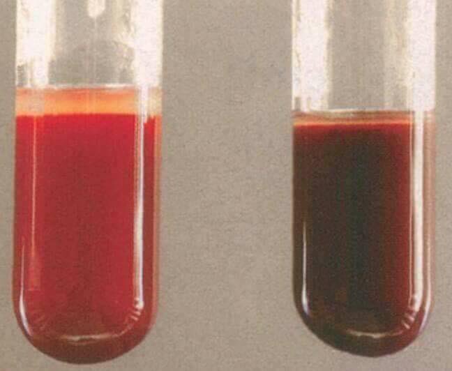 La sangre arterial tiene un color rojo intenso mientras que la sangre venosa es un tono rojo más oscuro