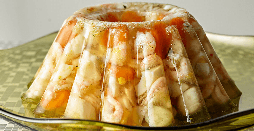 Kall maträtt med kött, grönsaker eller fisk i gelé, som får sin intressanta figur av formen som den tillagas i, som ofta har samma namn som maträtten.