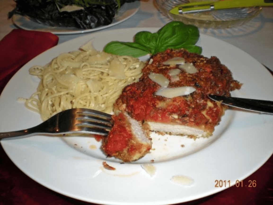FOOD - BREADED VEAL (MEAT) TOPPED WITH CHEESE & PASTA SAUCE, USUALLY SERVED WITH PASTA
